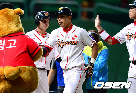 25일 오후 인천 문학구장에서 열린 '2013 한국야쿠르트 세븐 프로야구' SK 와이번스와 삼성 라이온즈의 경기, 1회말 2사 1,2루 SK 한동민이 선취 3점 홈런을 날린후 동료들의 축하를 받고 있다