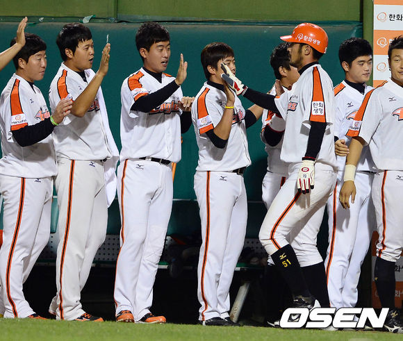 25일 오후 대전구장에서 열린 '2013 한국야쿠르트 세븐 프로야구' 한화 이글스와 LG 트윈스의 경기 2회말 1사 1,2루 이대수의 1타점 적시타에 홈을 밟은 2루주자 김경언이 덕아웃에서 동료들과 하이파이브를 하고 있다.