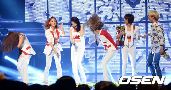 25일 오후 서울 유니클로 악스홀에서 진행된 MBC MUSIC '쇼 챔피언'에서 쇼챔피언송을 차지한 카라가 기뻐하고 있다.