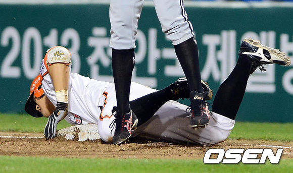25일 오후 대전구장에서 열린 '2013 한국야쿠르트 세븐 프로야구' 한화 이글스와 LG 트윈스의 경기 3회말 1사 이양기가 내야안타를 치고 1루에서 세이프되고 있다.