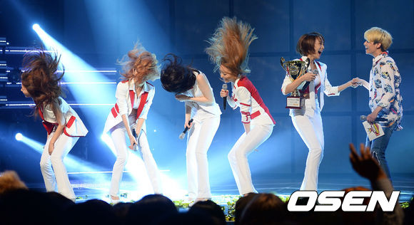 25일 오후 서울 유니클로 악스홀에서 진행된 MBC MUSIC '쇼 챔피언'에서 쇼챔피언송을 차지한 카라가 기뻐하고 있다.