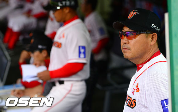 25일 오후 인천 문학구장에서 열린 '2013 한국야쿠르트 세븐 프로야구' SK 와이번스와 삼성 라이온즈의 경기, 4회말 SK 이만수 감독이 경기를 지켜보고 있다.