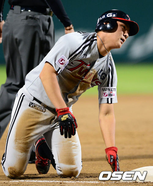 25일 오후 대전구장에서 열린 '2013 한국야쿠르트 세븐 프로야구' 한화 이글스와 LG 트윈스의 경기 5회초 2사 2루 박용택 타석, 유창식의 폭투사이 3루 진루를 시도한 오지환이 아웃당한 후 아쉬워하고 있다.