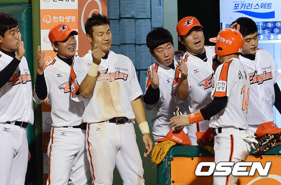 25일 오후 대전구장에서 열린 '2013 한국야쿠르트 세븐 프로야구' 한화 이글스와 LG 트윈스의 경기 6회말 1사 2루 정범모의 1타점 적시타에 홈을 밟은 이대수가 동료들과 하이파이브를 하고 있다.