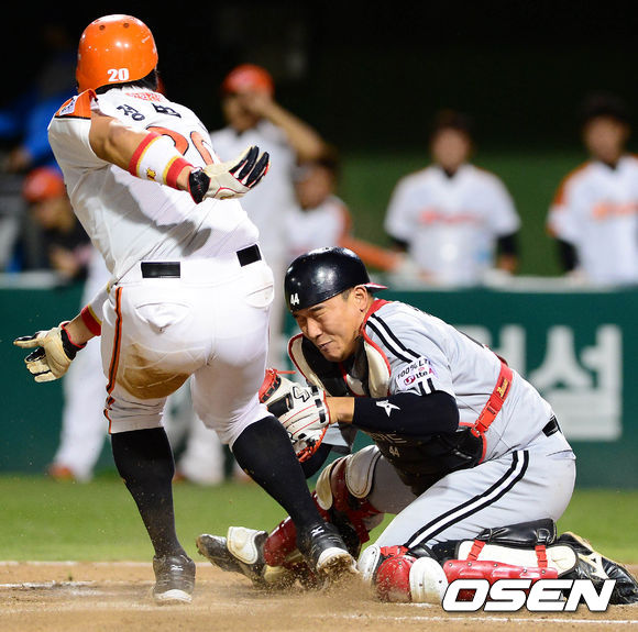 25일 오후 대전구장에서 열린 '2013 한국야쿠르트 세븐 프로야구' 한화 이글스와 LG 트윈스의 경기 6회말 2사 2루 한상훈의 우전안타 상황, 홈까지 쇄도하던 2루주자 정범모가 홈에서 태그아웃 당하고 있다.