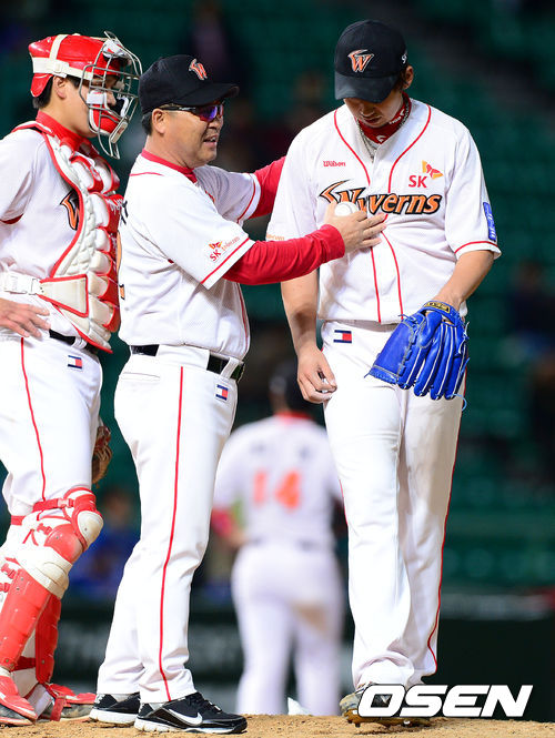 25일 오후 인천 문학구장에서 열린 '2013 한국야쿠르트 세븐 프로야구' SK 와이번스와 삼성 라이온즈의 경기, 8회초 무사에서 연속 안타를 허용한 SK 선발투수 윤희상이 교체되고 있다