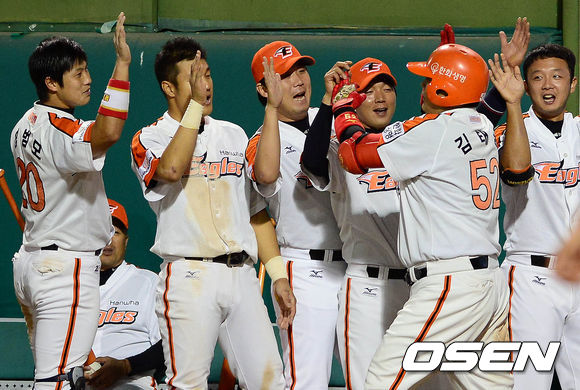 25일 오후 대전구장에서 열린 '2013 한국야쿠르트 세븐 프로야구' 한화 이글스와 LG 트윈스의 경기 7회말 2사 1,3루 김태균이 스리런포를 치고 동료들과 하이파이브를 하고 있다.
