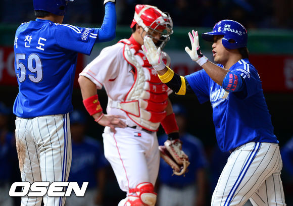 25일 오후 인천 문학구장에서 열린 '2013 한국야쿠르트 세븐 프로야구' SK 와이번스와 삼성 라이온즈의 경기 8회초 무사 1,3루 삼성 박석민이 역전 3점 홈런을 날리고 주자 박찬도와 하이파이브를 하고 있다