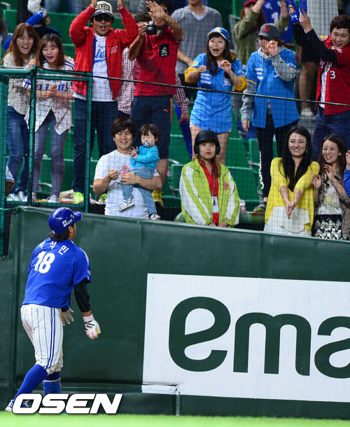 25일 오후 인천 문학구장에서 열린 '2013 한국야쿠르트 세븐 프로야구' SK 와이번스와 삼성 라이온즈의 경기 8회초 무사 1,3루 삼성 박석민이 역전 3점 홈런을 날리고 팬들에게 자신의 아대를 던지고 있다.