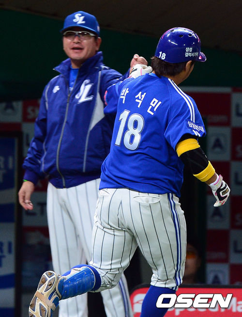 25일 오후 인천 문학구장에서 열린 '2013 한국야쿠르트 세븐 프로야구' SK 와이번스와 삼성 라이온즈의 경기 8회초 무사 1,3루 삼성 박석민이 역전 3점 홈런을 날리고 류중일 감독과 하이파이브를 하고 있다