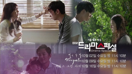 KBS 2TV '드라마스페셜 단막 2013'이 야심 차게 준비한 '가을 멜로 특집 3부작'이 오랜 기다림 끝에 내달 2일 부터 가을 사랑의 풍경 속으로 여행을 떠날 예정이다. 내달 2일 ‘비의 나라’(극본 이아람, 연출 안준용), 9일 ‘당신의 누아르’ (극본 김욱, 연출 이소연), 16일 ‘그렇고 그런 사이’ (극본 홍정희, 연출 한상우)가 차례로 안방 극장을 찾는 것.