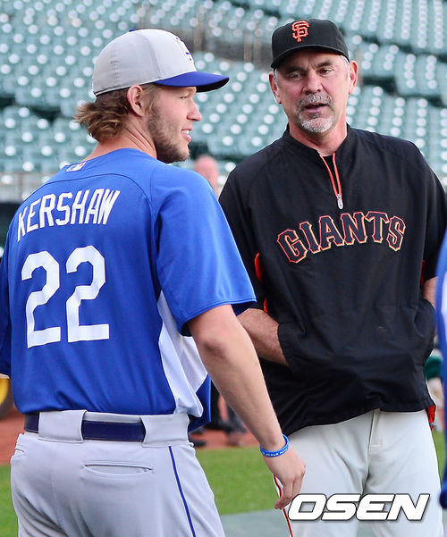 26일 (이하 한국시간) 미국 캘리포니아 샌프란시스코 AT&T 파크에서 열린 2013 메이저리그 샌프란시스코 자이언츠와 LA 다저스 경기, 경기 전 샌프란시스코 자이언츠 브루스 보치 감독이 다저스 클레이튼 커쇼와 얘기를 나누고 있다.