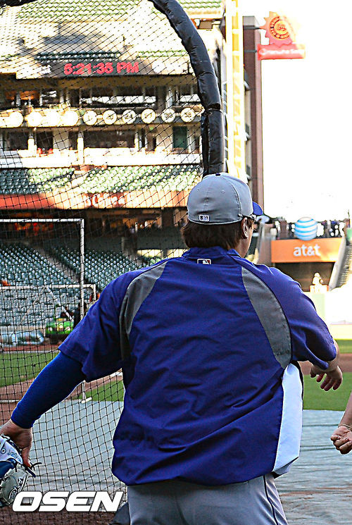 26일 (이하 한국시간) 미국 캘리포니아 샌프란시스코 AT&T 파크에서 열린 2013 메이저리그 샌프란시스코 자이언츠와 LA 다저스 경기, 경기 전 다저스 류현진이 그라운드에서 태양 모양의 한화 광고판 아래서 몸을 풀고 있다.