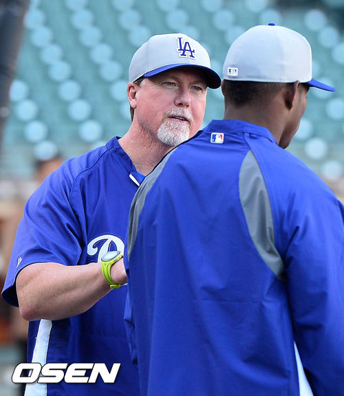 26일 (이하 한국시간) 미국 캘리포니아 샌프란시스코 AT&T 파크에서 열린 2013 메이저리그 샌프란시스코 자이언츠와 LA 다저스 경기, 경기 전 다저스 마크 맥과이어 타격 코치가 야시엘 푸이그와 얘기를 나누고 있다.