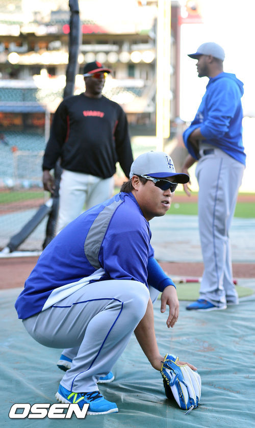 26일 (이하 한국시간) 미국 캘리포니아 샌프란시스코 AT&T 파크에서 열린 2013 메이저리그 샌프란시스코 자이언츠와 LA 다저스 경기, 경기 전 다저스 류현진이 몸을 풀던 중 휴식을 취하고 있다.