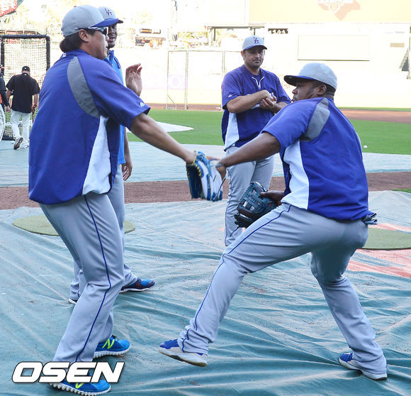 26일 (이하 한국시간) 미국 캘리포니아 샌프란시스코 AT&T 파크에서 열린 2013 메이저리그 샌프란시스코 자이언츠와 LA 다저스 경기, 경기 전 다저스 류현진이 후안 유리베가 장난을 치고 있다.