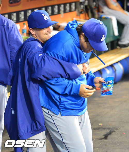 26일 (이하 한국시간) 미국 캘리포니아 샌프란시스코 AT&T 파크에서 열린 2013 메이저리그 샌프란시스코 자이언츠와 LA 다저스 경기, 경기 전 다저스 류현진이 페데로위츠와 장난을 치고 있다.