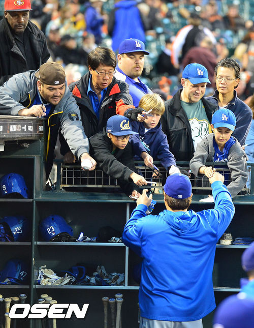 26일 (이하 한국시간) 미국 캘리포니아 샌프란시스코 AT&T 파크에서 열린 2013 메이저리그 샌프란시스코 자이언츠와 LA 다저스 경기, 경기 전 다저스 류현진이 덕아웃에서 팬들에게 사인을 해주고 있다.