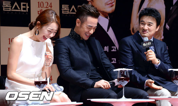 26일 오전 서울 광진구 롯데시네마에서 진행된 영화 '톱스타'(박중훈 감독) 제작보고회에서 소이현 엄태웅 박중훈감독의 이야기를 들으며 미소짓고 있다.