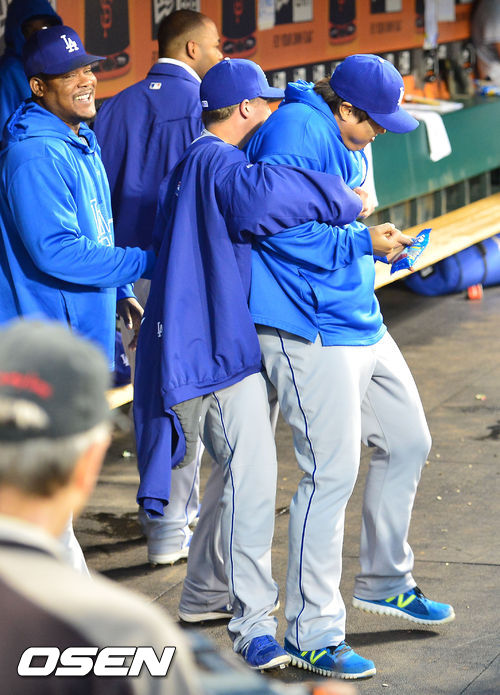 26일 (이하 한국시간) 미국 캘리포니아 샌프란시스코 AT&T 파크에서 열린 2013 메이저리그 샌프란시스코 자이언츠와 LA 다저스 경기, 경기 전 다저스 류현진이 덕아웃에서 팀 페데로위츠와 장난을 치고 있다.