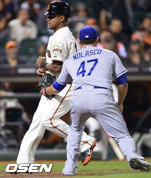 26일 (이하 한국시간) 미국 캘리포니아 샌프란시스코 AT&T 파크에서 열린 2013 메이저리그 샌프란시스코 자이언츠와 LA 다저스 경기, 2회말 1사 주자 3루 지토 타석에서 3루 주자 아브레이유가 홈으로 도루를 시도, 놀라스코에게 태그아웃을 당하고 있다.