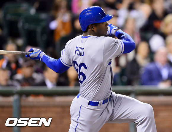 26일 (이하 한국시간) 미국 캘리포니아 샌프란시스코 AT&T 파크에서 열린 2013 메이저리그 샌프란시스코 자이언츠와 LA 다저스 경기, 4회초 선두타자 다저스의 야시엘 푸이그가 좌전 안타를 날리고 있다.