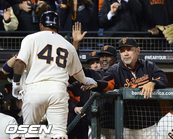 26일 (이하 한국시간) 미국 캘리포니아 샌프란시스코 AT&T 파크에서 열린 2013 메이저리그 샌프란시스코 자이언츠와 LA 다저스 경기, 4회말 1사 주자 1루 샌프란시스코 파블로 산도발이 좌월 투런 홈런을 날린 후 덕아웃에서 브루스 보치 감독과 하이파이브를 하고 있다.
