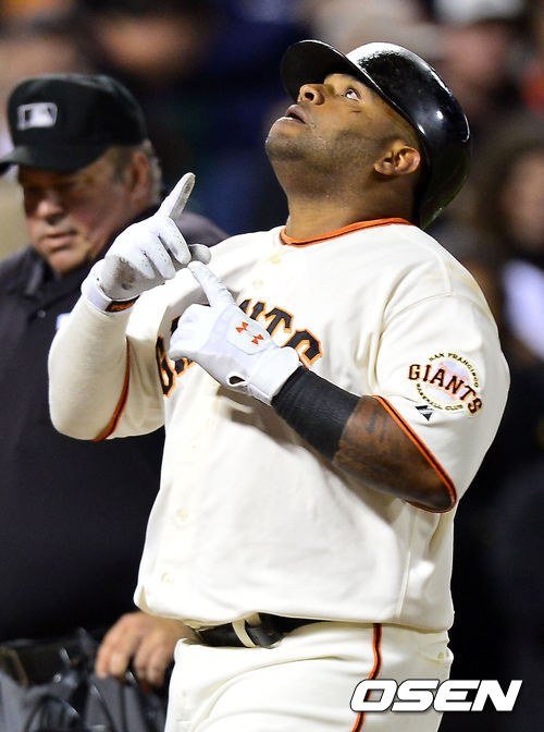 26일 (이하 한국시간) 미국 캘리포니아 샌프란시스코 AT&T 파크에서 열린 2013 메이저리그 샌프란시스코 자이언츠와 LA 다저스 경기, 4회말 1사 주자 1루 샌프란시스코 파블로 산도발이 좌월 투런 홈런을 날린 후 홈을 밟으며 기뻐하고 있다.