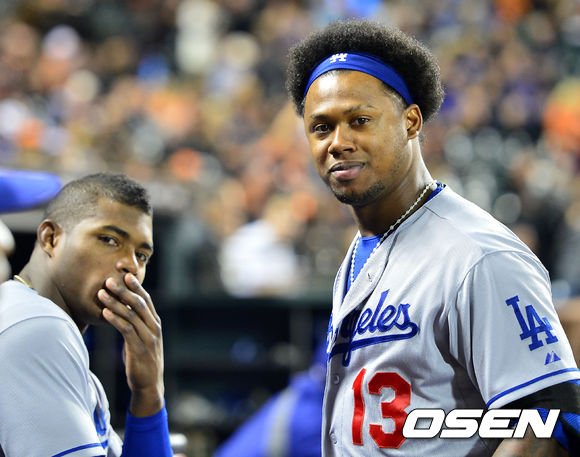 26일 (이하 한국시간) 미국 캘리포니아 샌프란시스코 AT&T 파크에서 열린 2013 메이저리그 샌프란시스코 자이언츠와 LA 다저스 경기, 8회 덕아웃에서 다저스 핸리 라미레스와 야시엘 푸이그가 취재진의 카메라를 응시하고 있다.