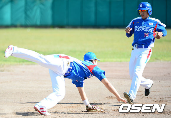 야구 국가대표팀 강민국이 수비 훈련을 하고 있다.