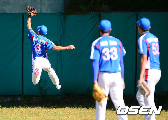 야구 국가대표팀 최민구가 수비 훈련을 하고 있다.