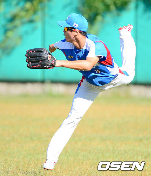 야구 국가대표팀 한덕교가 수비 훈련을 하고 있다.