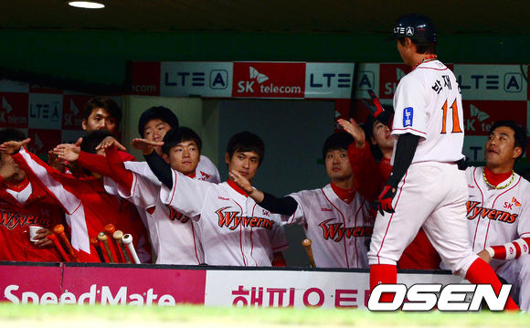 26일 오후 인천 문학구장에서 열린 '2013 한국야쿠르트 세븐 프로야구' SK 와이번스와 삼성 라이온즈의 경기 1회말 1사 3루 최정의 1타점 적시타에 홈을 밟은 박재상이 덕아웃에서 동료들과 하이파이브를 하고 있다.