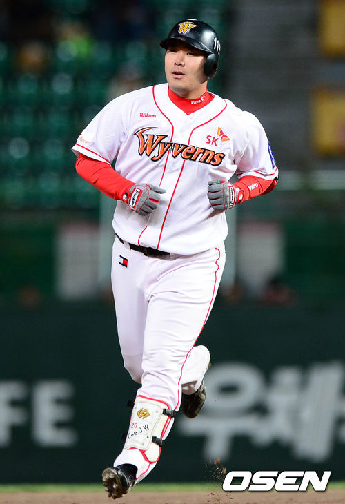 26일 오후 인천 문학구장에서 열린 '2013 한국야쿠르트 세븐 프로야구' SK 와이번스와 삼성 라이온즈의 경기 4회말 1사 1루 이재원이 투런포를 치고 베이스를 돌고 있다.