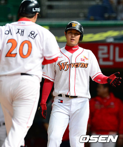 26일 오후 인천 문학구장에서 열린 '2013 한국야쿠르트 세븐 프로야구' SK 와이번스와 삼성 라이온즈의 경기 4회말 1사 1루 이재원이 투런포를 치고 홈에서 1루주자 최정과 하이파이브를 하고 있다.