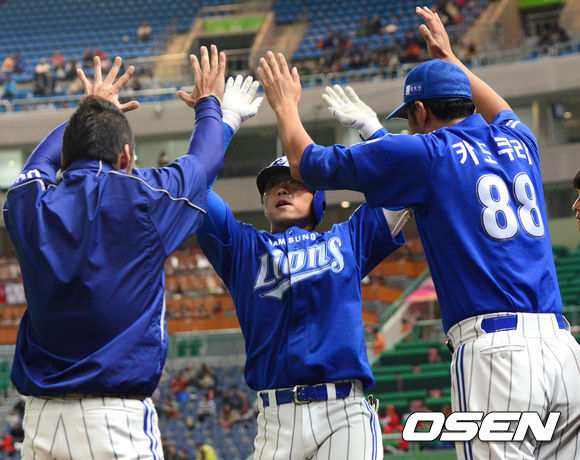 26일 오후 인천 문학구장에서 열린 '2013 한국야쿠르트 세븐 프로야구' SK 와이번스와 삼성 라이온즈의 경기 7회초 선두타자 이상훈이 솔로포를 치고 동료들과 하이파이브를 하고 있다.