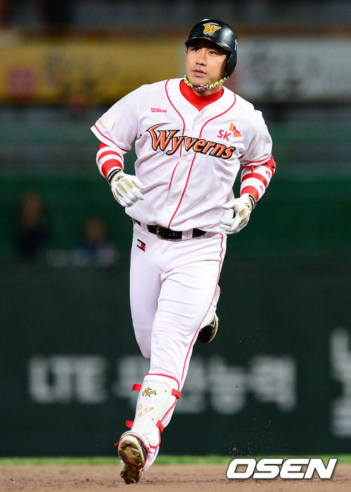 26일 오후 인천 문학구장에서 열린 '2013 한국야쿠르트 세븐 프로야구' SK 와이번스와 삼성 라이온즈의 경기 7회말 1사 1루 김강민이 투런포를 치고 베이스를 돌고 있다.