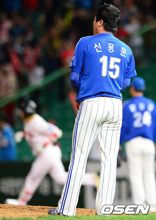26일 오후 인천 문학구장에서 열린 '2013 한국야쿠르트 세븐 프로야구' SK 와이번스와 삼성 라이온즈의 경기 7회말 1사 1루 김강민에게 투런포를 허용한 신용운이 마운드에 서 있다.