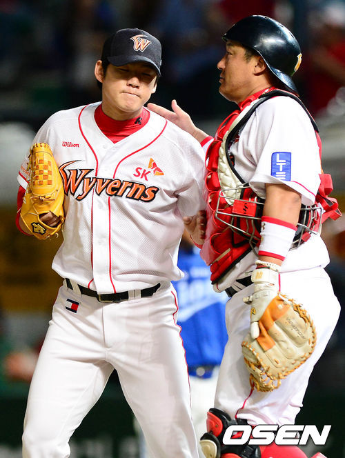 26일 오후 인천 문학구장에서 열린 '2013 한국야쿠르트 세븐 프로야구' SK 와이번스와 삼성 라이온즈의 경기 종료 후 박희수와 조인성이 하이파이브를 하고 있다.