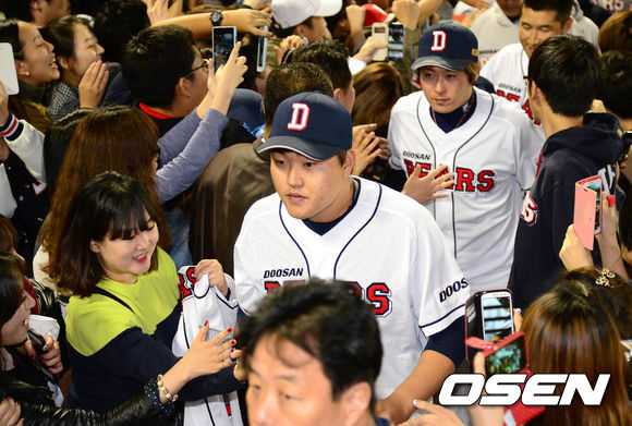 경기 종료 후 두산 선수들이 관중석으로 향하고 있다. /sunday@osen.co.kr