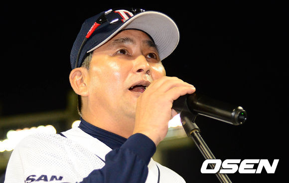 경기 종료 후 관중석을 찾은 두산 김진욱 감독이 팬들에게 포스트시즌 각오를 밝히고 있다. /sunday@osen.co.kr