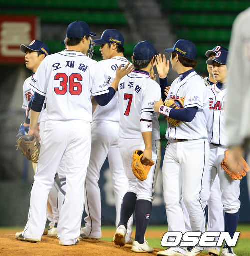 경기 종료 후 두산 선수들이 승리의 기쁨을 나누고 있다. /sunday@osen.co.kr