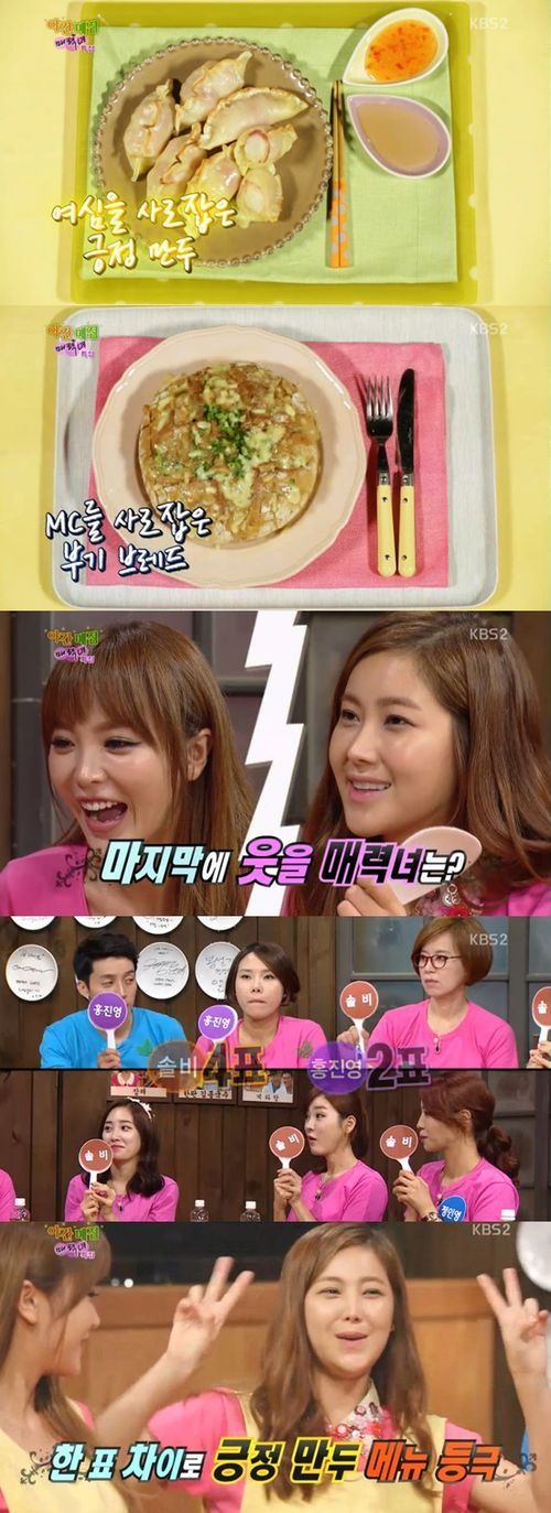 여자 아나운서들의 마음을 사로잡은 솔비의 긍정만두가 홍진영의 부기브레드를 제치고 ‘해투’ 야간 메뉴로 등록됐다.
