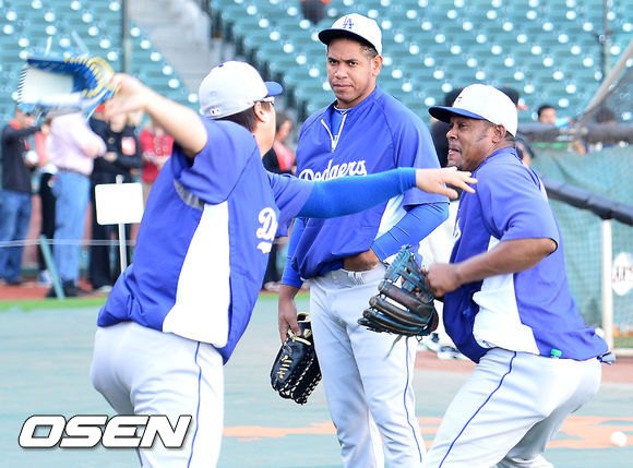 27일 (이하 한국시간) 미국 캘리포니아 샌프란시스코 AT&T 파크에서 2013 메이저리그 샌프란시스코 자이언츠와 LA 다저스 경기가 열릴 예정인 가운데 양팀 훈련 시간에 다저스 류현진이 다저스 후안 유리베와 장난을 치고 있다.