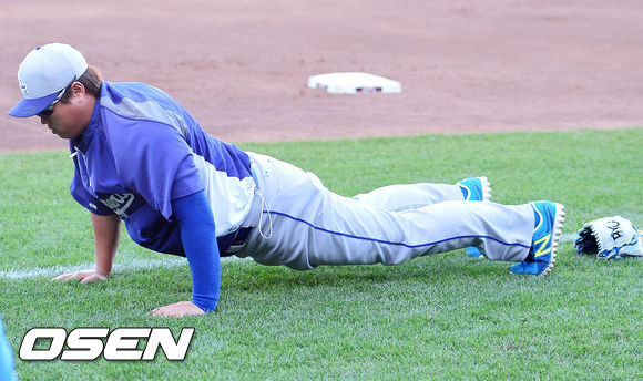 27일 (이하 한국시간) 미국 캘리포니아 샌프란시스코 AT&T 파크에서 2013 메이저리그 샌프란시스코 자이언츠와 LA 다저스 경기가 열릴 예정인 가운데 양팀 훈련 시간에 다저스 류현진이 몸을 풀고 있다.