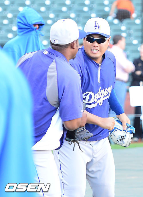 27일 (이하 한국시간) 미국 캘리포니아 샌프란시스코 AT&T 파크에서 2013 메이저리그 샌프란시스코 자이언츠와 LA 다저스 경기가 열릴 예정인 가운데 양팀 훈련 시간에 다저스 류현진과 후안 유리베가 장난을 치고 있다.