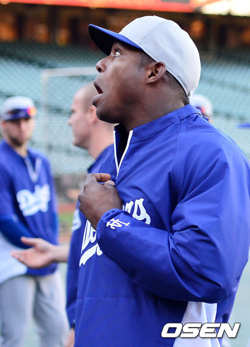 27일 (이하 한국시간) 미국 캘리포니아 샌프란시스코 AT&T 파크에서 2013 메이저리그 샌프란시스코 자이언츠와 LA 다저스 경기가 열릴 예정인 가운데 양팀 훈련 시간에 다저스 푸이그가 놀란 표정을 짓고 있다.