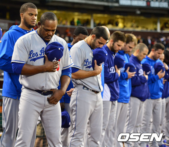 27일 (이하 한국시간) 미국 캘리포니아 샌프란시스코 AT&T 파크에서 열린 2013 메이저리그 샌프란시스코 자이언츠와 LA 다저스 경기, 어제 경기가 끝난 뒤 AT&T파크 인근에서 두 팀 팬들이 패싸움을 벌인 끝에 한 명이 사망한 사건에 대해 경기전 묵념이 이루워지고 있다.
