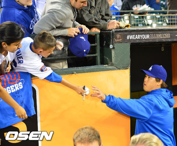 27일 (이하 한국시간) 미국 캘리포니아 샌프란시스코 AT&T 파크에서 열린 2013 메이저리그 샌프란시스코 자이언츠와 LA 다저스 경기, 덕아웃에서 류현진이 어린이 팬에게 사인을 해주고 있다.