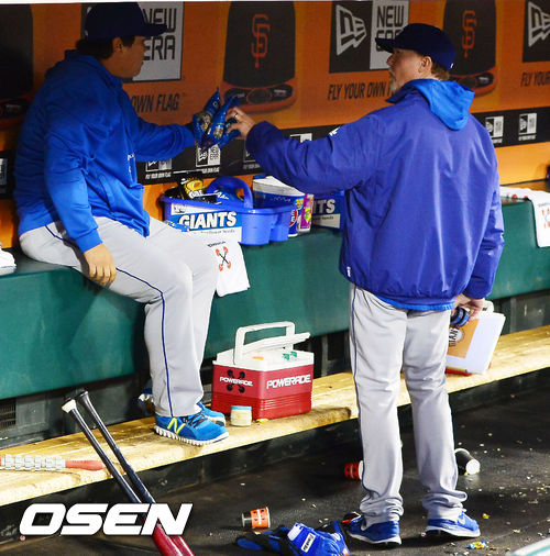 27일 (이하 한국시간) 미국 캘리포니아 샌프란시스코 AT&T 파크에서 열린 2013 메이저리그 샌프란시스코 자이언츠와 LA 다저스 경기, 덕아웃에서 류현진이 마크 맥과이어 타격 코치에게 해바라기씨 봉지를 주고 있다.